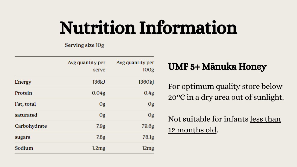 This product is a genuine, mono-floral mānuka honey with a guaranteed minimum of 83mg/kg MGO. While collecting mānuka nectar, the bees will also visit other floral sources that are naturally included within this honey, giving it a milder flavour and lighter colour. UMF 5+ is a great alternative to standard table honey and an excellent entry level UMF mānuka honey.